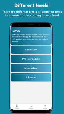 “English Grammar Tests” is the best application to learn English grammar. More than 10 000 premium quality English grammar multiple-choice questions are ready for you to solve in a fun way. The questions are properly sorted by their level so that you can solve questions according to your level. For best use of the app, it is recommended to begin with questions at an elementary level and gradually move up. You can achieve improvement in your English skills intensely using the “English Grammar Tests” application.