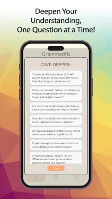 - Advance your Greek grammar mastery with exclusive tools such as the 'Dive Deeper' drill-down questions, personal interactive support from the AI Chatbot, and the comprehensive Phrase Correction service.