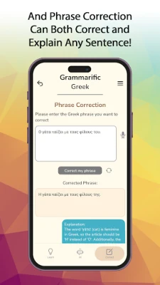 - Phrase Correction Functionality: Elevate your Greek writing skills with the Phrase Correction feature—submit your sentences and receive detailed feedback and explanations to improve both grammar and syntax.